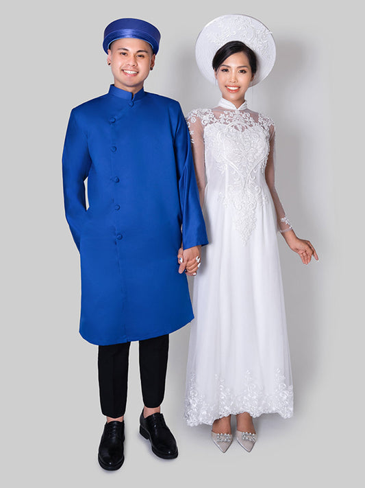 White Silk Women's & Blue Silk Men's Wedding Couple Vietnamese Ao Dai