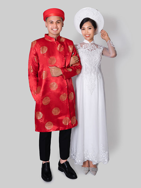 White & Red Coin Wedding Couple Vietnamese Ao Dai