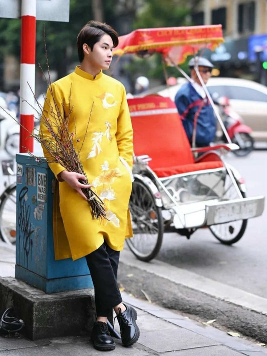 Men Yellow Embroidery Lotus Koi Ao Dai Top