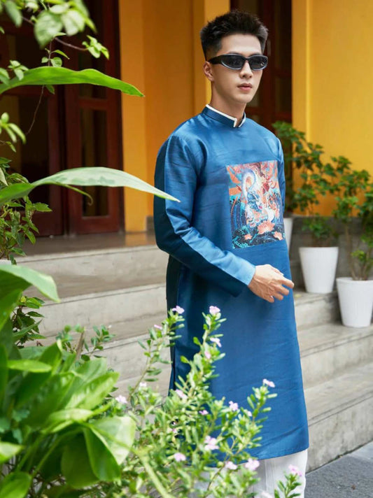 Ao Dai Vietnam Men Blue Moon Hac Ao Dai Set