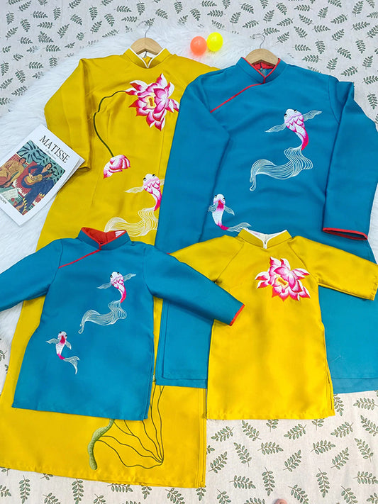 Family Ao Dai Yellow Turquoise Koi Ao Dai Women Girl Ao Dai Top Pants Men Boy Ao Dai Top
