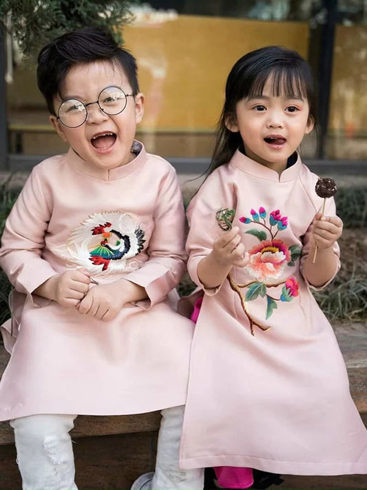 Family Ao Dai Pink Blush Embroidery Women Girl Ao Dai Top Pants Men Boy Ao Dai Top