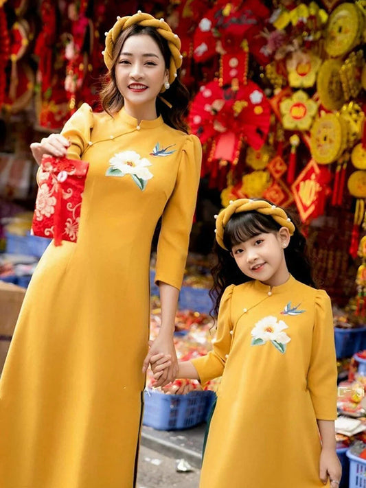 Family Ao Dai Yellow Embroidery Ao Dai Dress