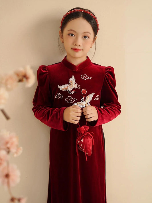 Family Ao Dai Mom And Daughter Red Velvet Includes One Ao Dai Top And Pants