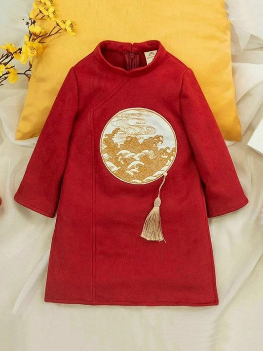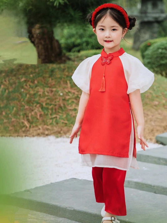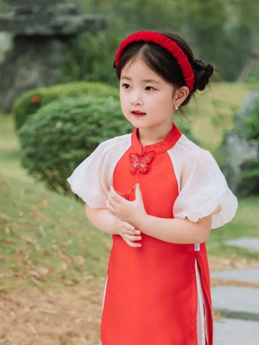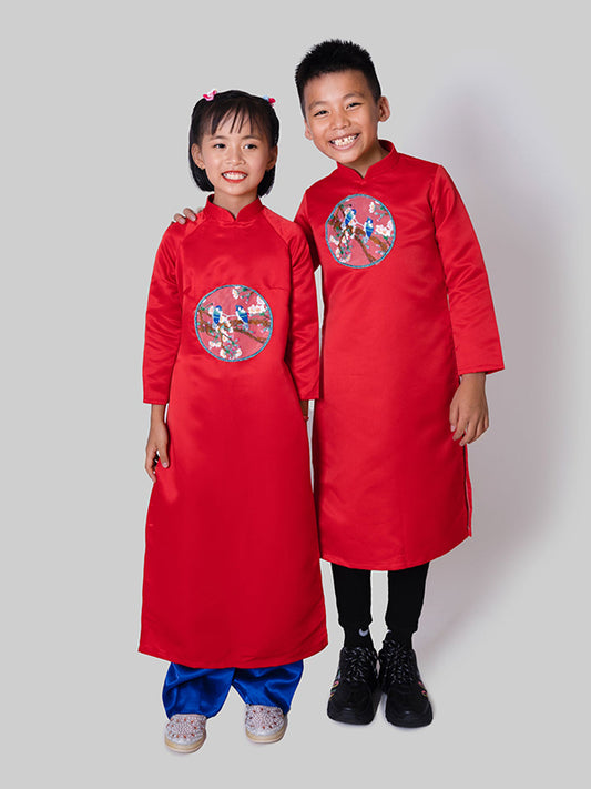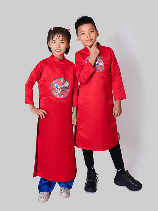 Girl & Boy's Red Silk Vietnamese Ao Dai Dress
