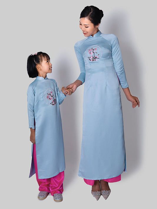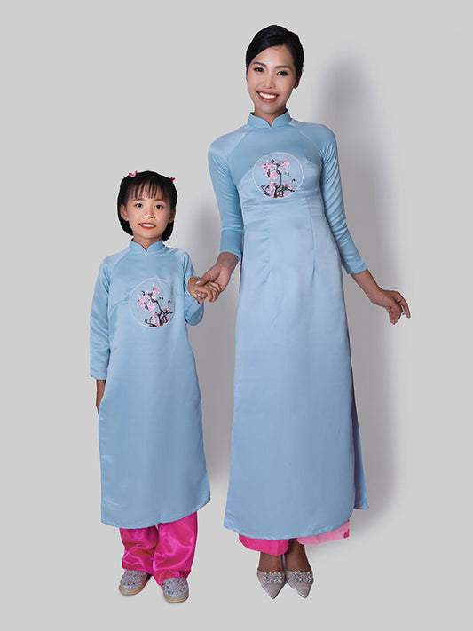 Mother & Daughter's Light Blue Silk Vietnamese Ao Dai Dress