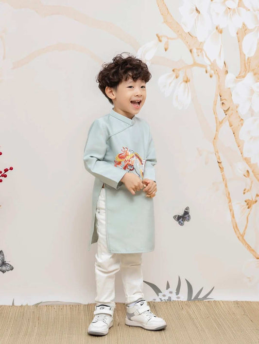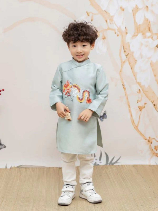 Kids Ao Dai Boy Light Blue Dragon Ao Dai Top Only