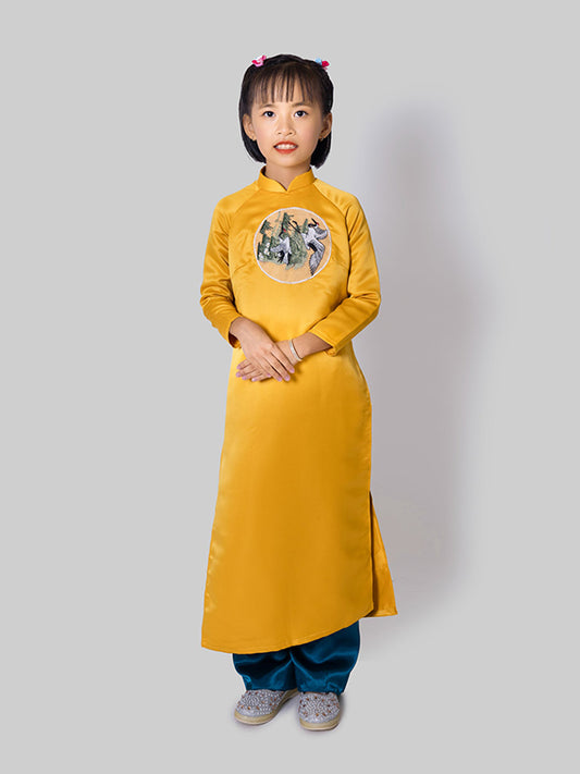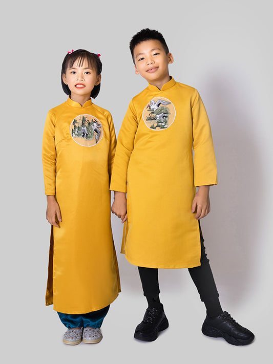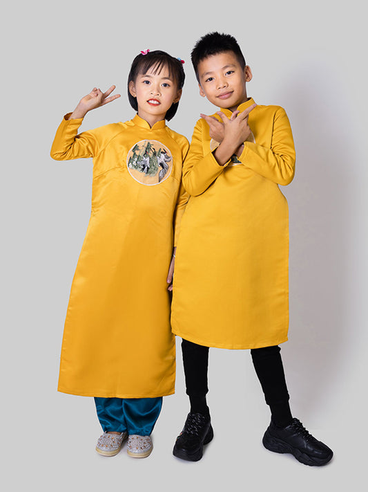 Girl & Boy's Yellow Silk Vietnamese Ao Dai Dress