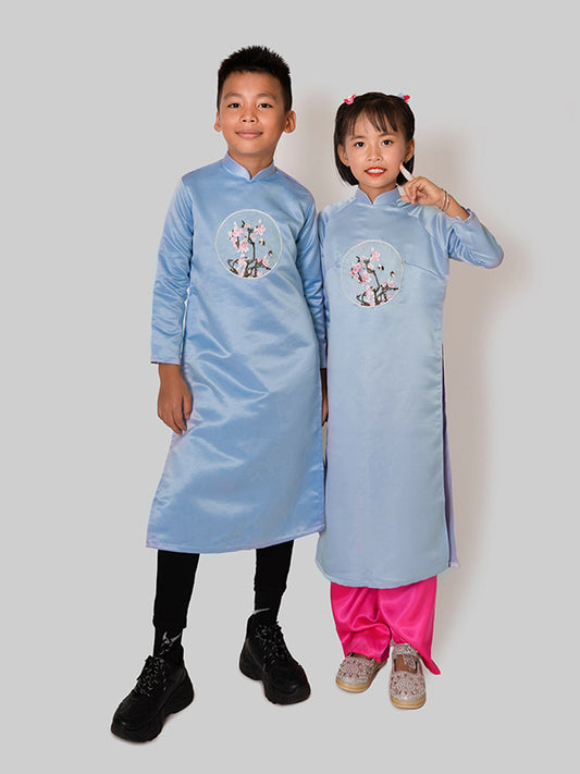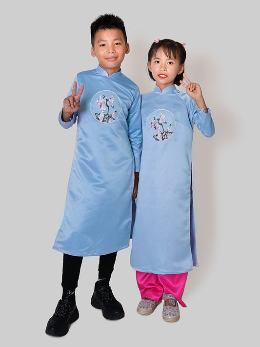 Girl & Boy's Light Blue Silk Vietnamese Ao Dai Dress