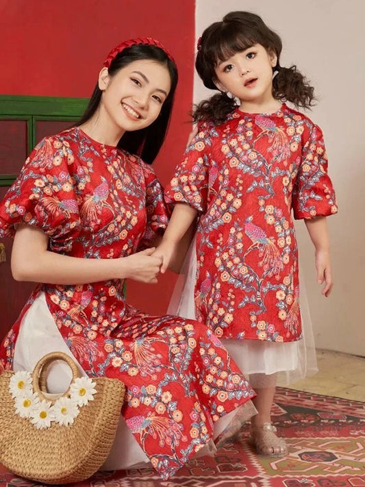 Kids Ao Dai Girl Red Ao Dai Set With Skirt