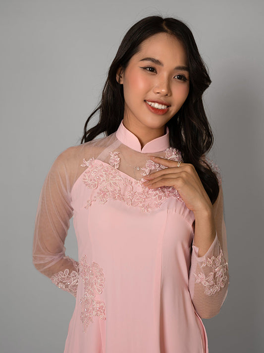 Pink Embroidered Cutout Ao Dai Vietnamese Dress