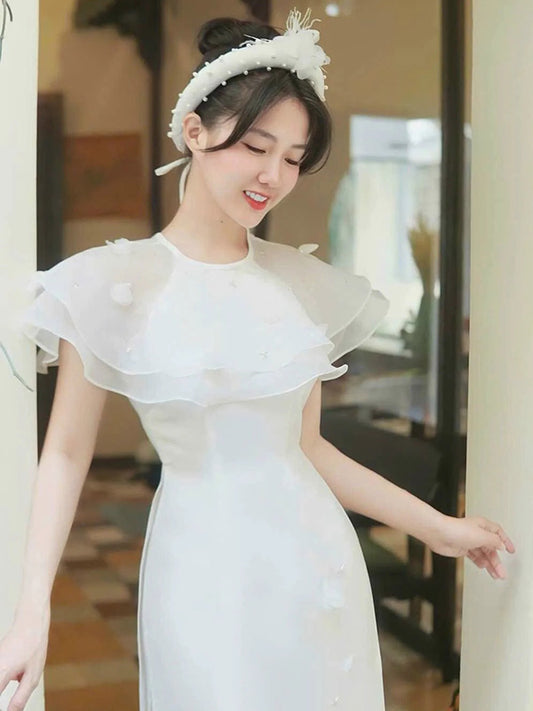 Ao Dai Vietnam White Removable Cape Include Ao Dai Top And Pants No Headband