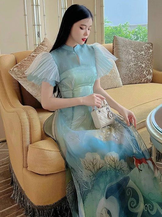 Ao Dai Vietnam Cyan Nightfalls Ruffle Sleeve Ao Dai Top And Pants