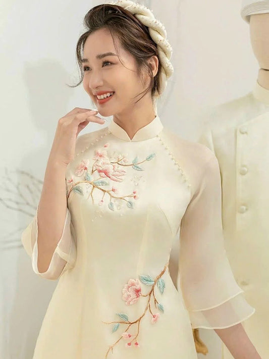 Ao Dai Vietnam Cream Button Floral Include Ao Dai Top And Pants No Headband