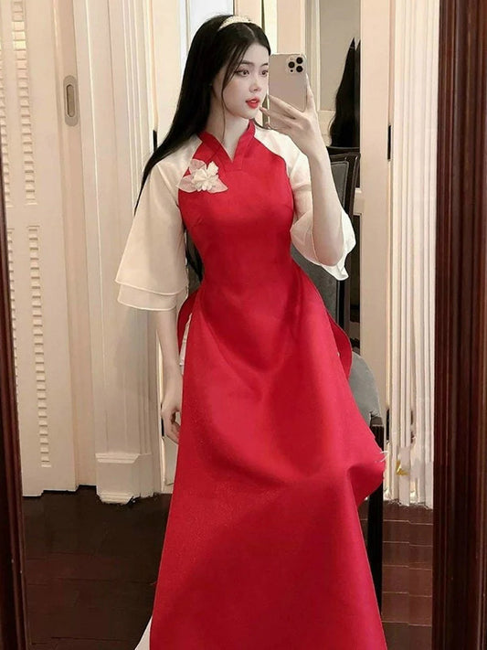 Ao Dai Vietnam Red Velvet With 3D Flower Include Ao Dai Top And Pants