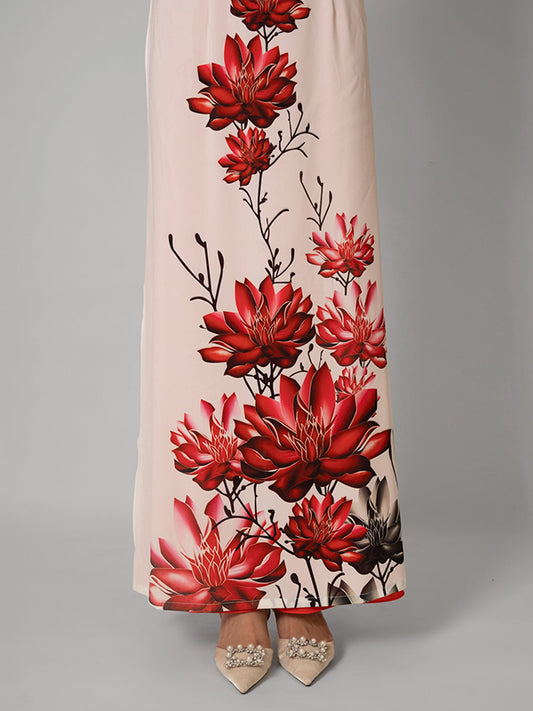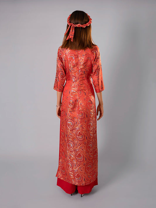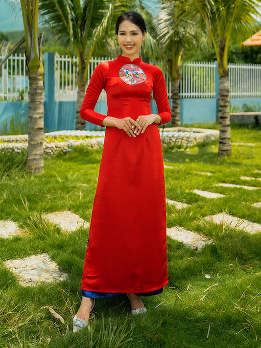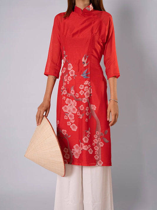 Red Satin Silk Print Ao Dai Vietnamese Dress
