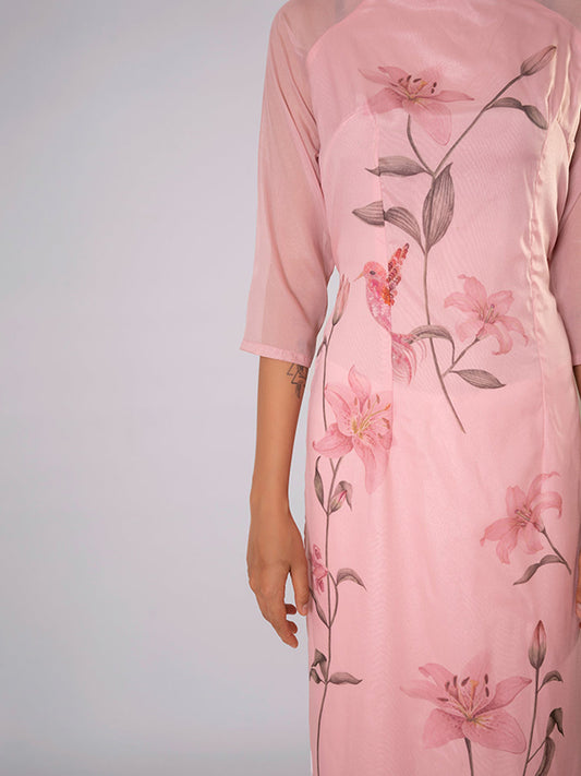 Baby Pink Silk Print Ao Dai Vietnamese Dress