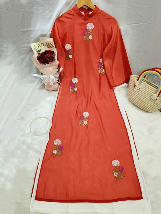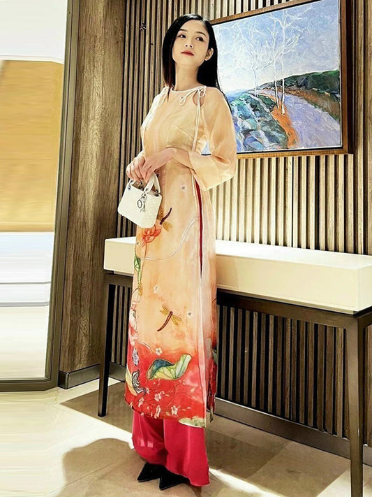 Ao Dai Vietnam Orange / Red Lotus Pond Chiffon Include Ao Dai Top And Pants
