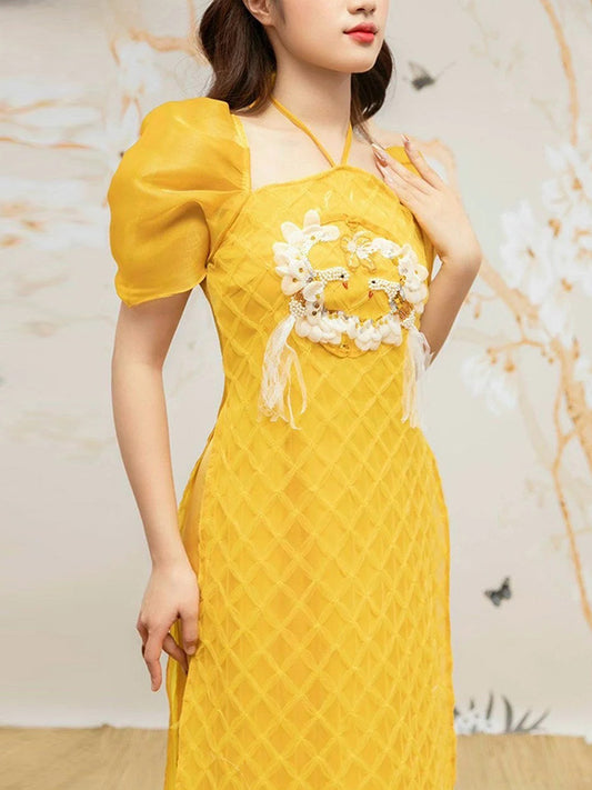 Ao Dai Vietnam Yellow Sparkle Feather Puffy Sleeves Include Ao Dai Top And Pants