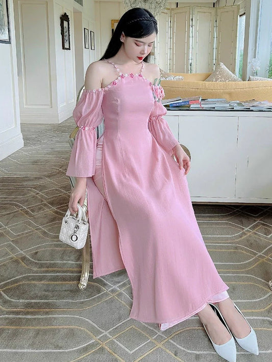 Ao Dai Vietnam Pink Off Shoulder 3D Roses Include Ao Dai Top And Pants