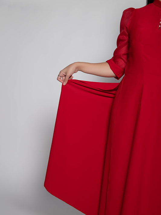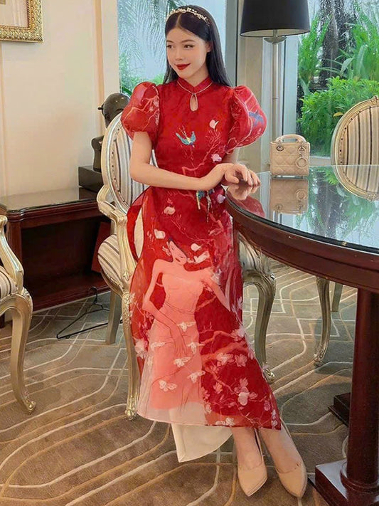 Puff Red Chiffon Women's Ao Dai Vietnamese Dress