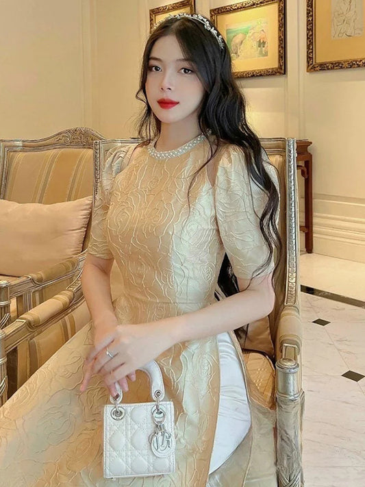 Ao Dai Vietnam Beige Pearl Cut-Out Puffy Sleeve Include Ao Dai Top And Pants