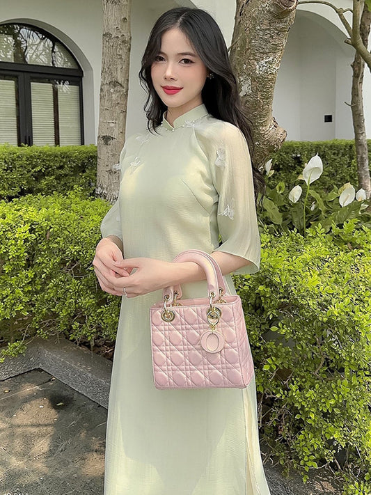 Ao Dai Vietnam Shifted Light Green 3D Butterflies Include Ao Dai Top And Pants
