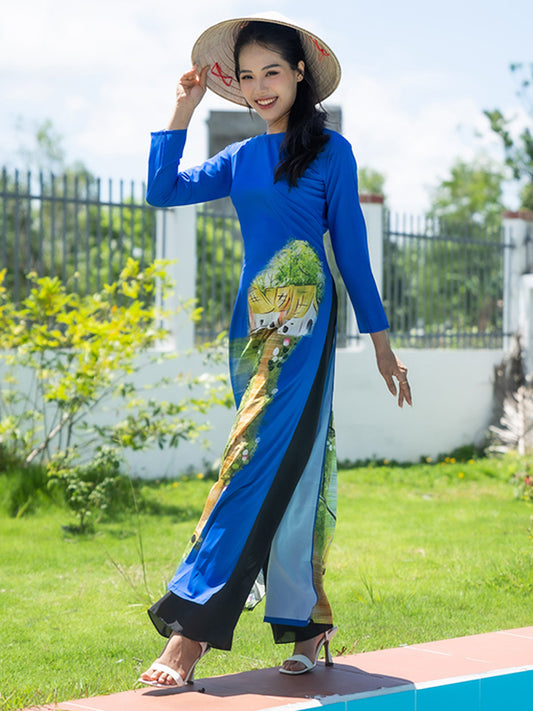 Blue Print Chiffon Women's Ao Dai Vietnamese Dress