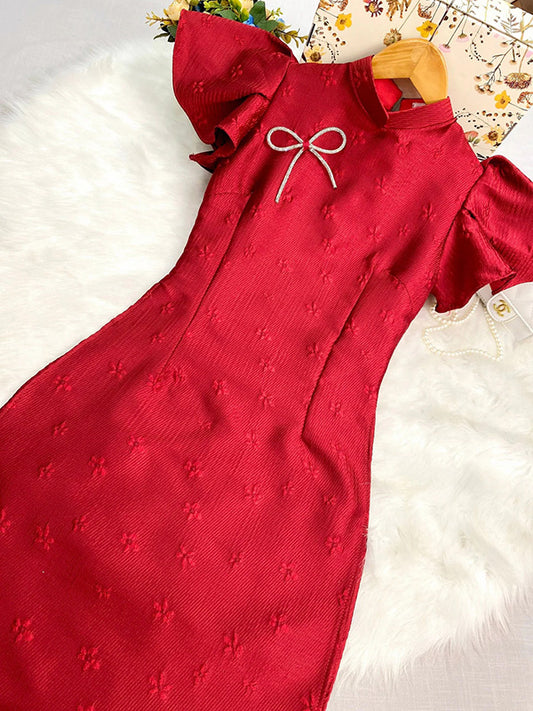 Ao Dai Vietnam Red Wing Sleeve With Bow Pin Include Ao Dai Top And Pants
