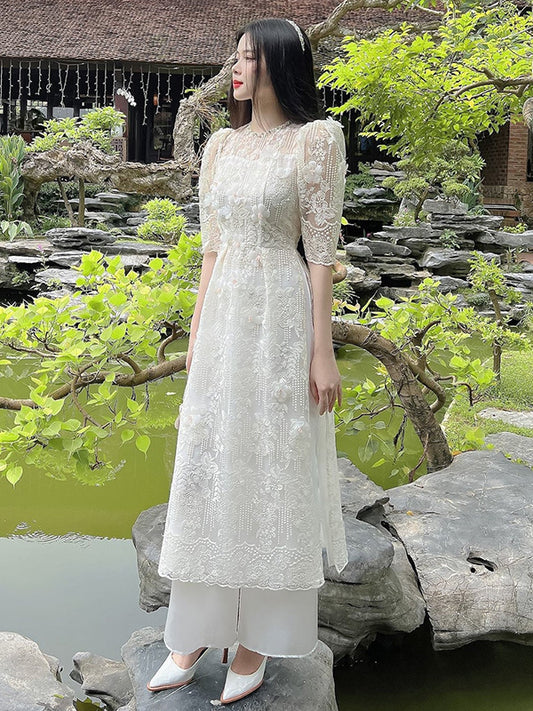 Ao Dai Vietnam Lace Cream Sparkle Neckline 3D Flower Include Ao Dai Top And Skirt