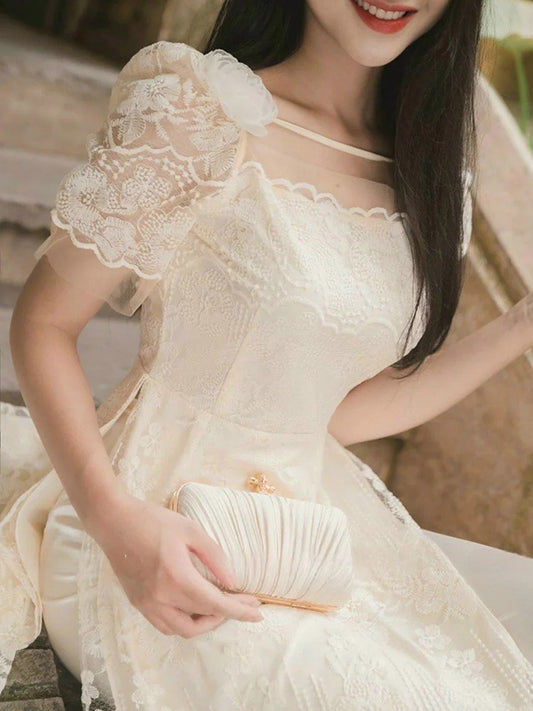 Ao Dai Vietnam Lace Cream Square Neckline 3D Flower Include Ao Dai Top And Skirt