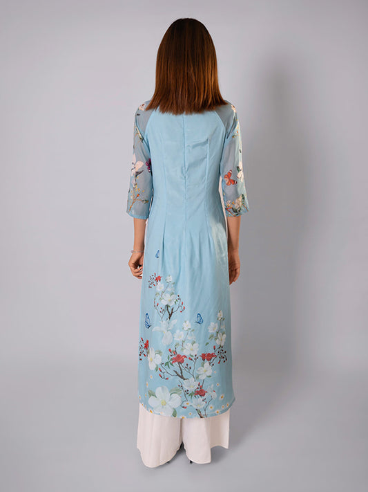 Blush Blue Silk Print Vietnamese Ao Dai Dress