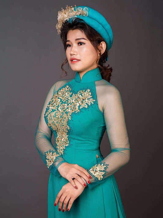 Blue Wedding Ao Dai Embroidered And Hand Beaded Fabric