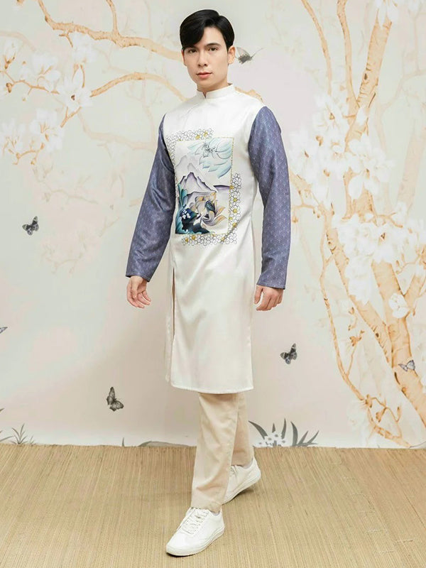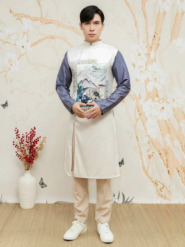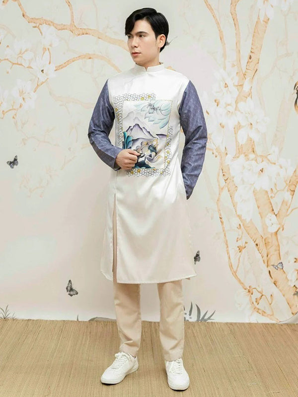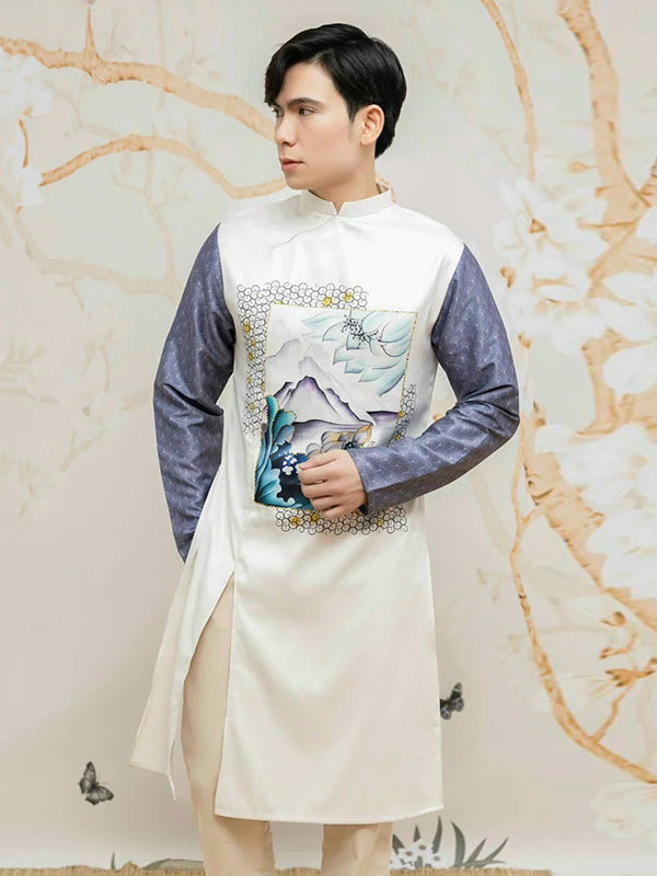 Ao Dai Men White & Blue Printed Mountain Ao Dai Vietnam