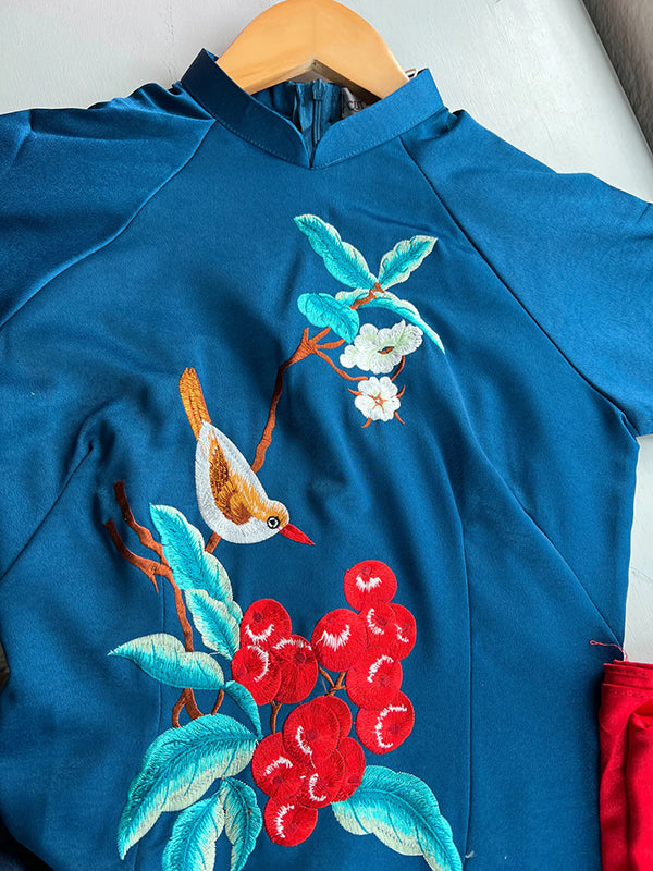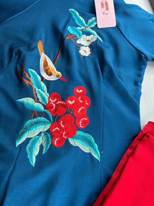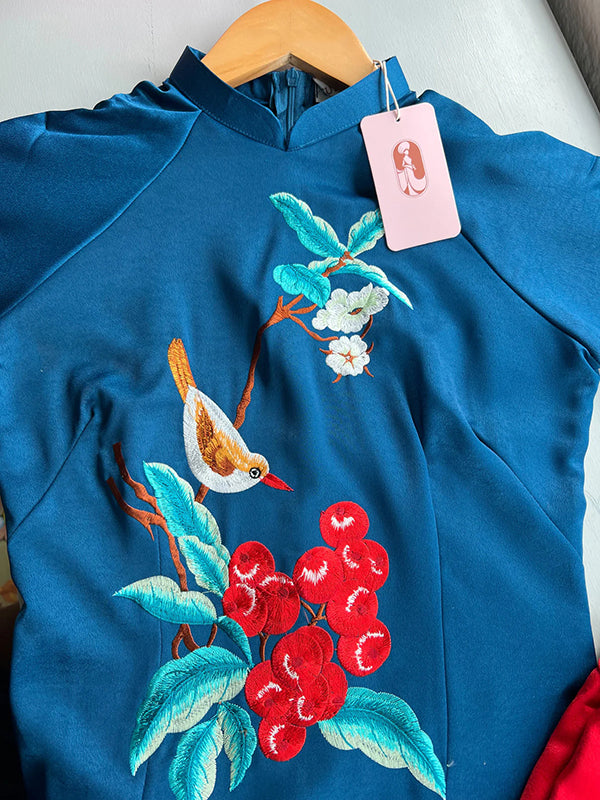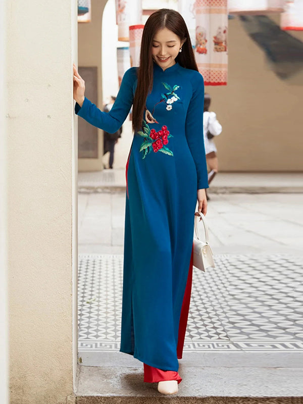 Ao Dai Vietnam Blue Embroidery Includes One Ao Dai Top And Pants