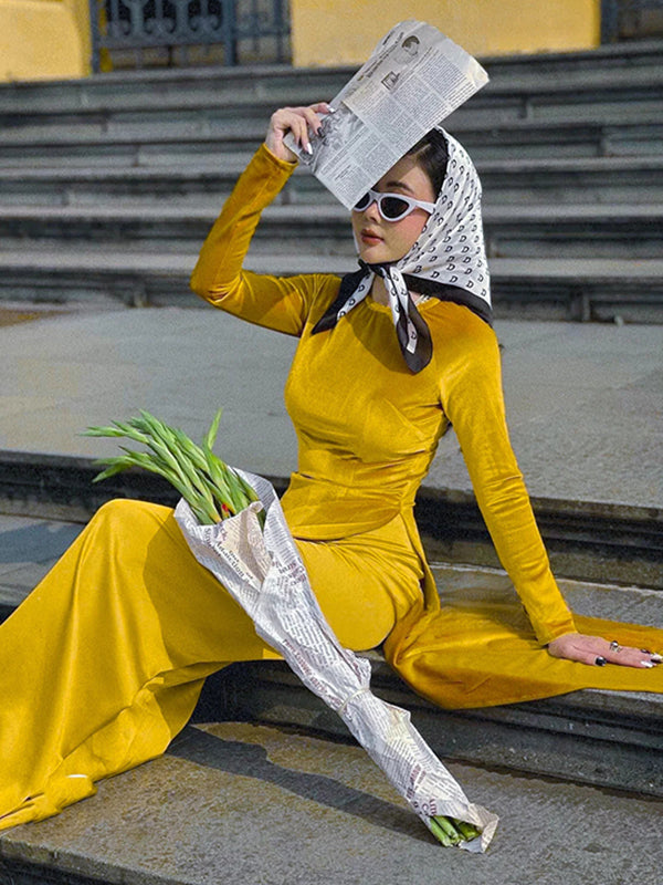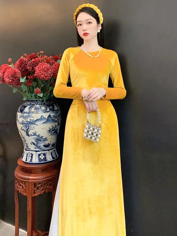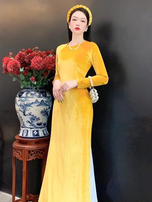 Ao Dai Vietnam Yellow Velvet Ao Dai Top Only