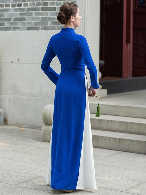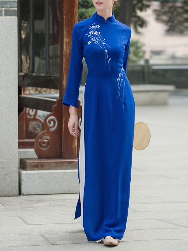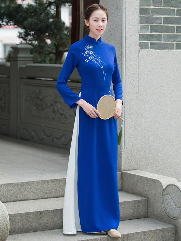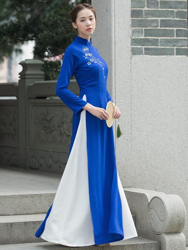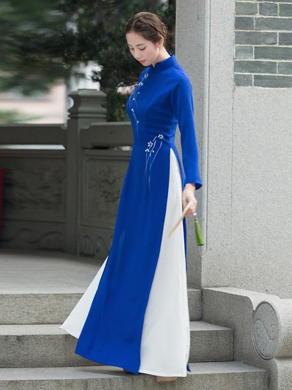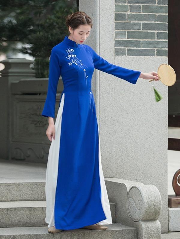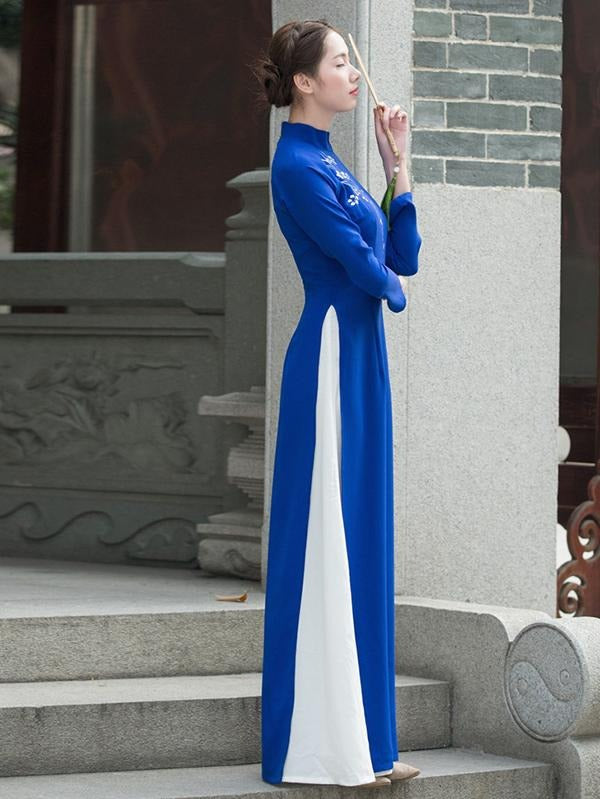 Ao Dai Vietnamese Dress Long Flare Sleeves Blue Aodaistyle