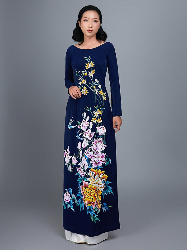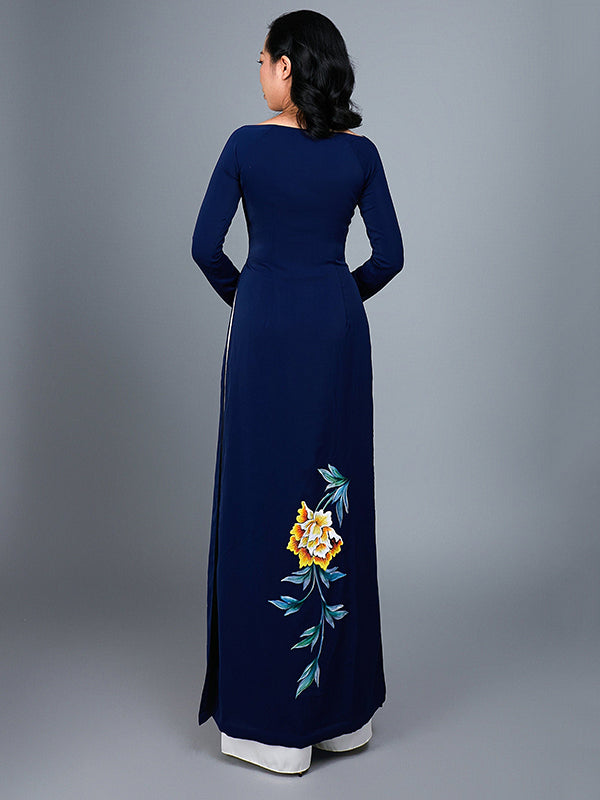 Custom Made Ao Dai Hand-Painted Dark Blue Silk