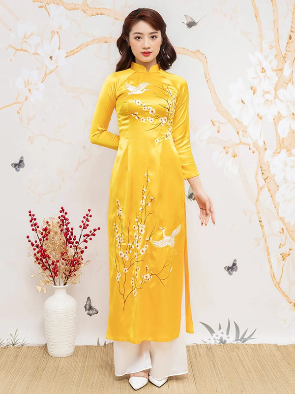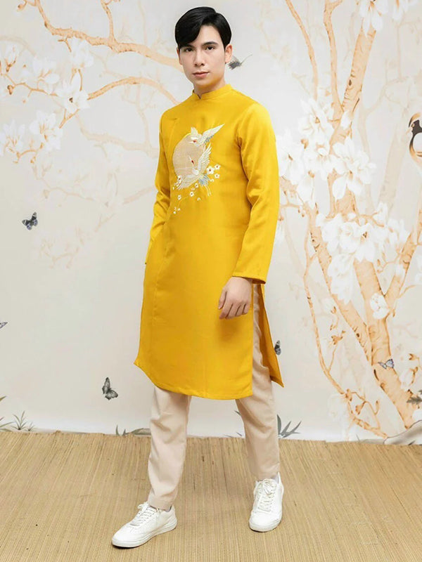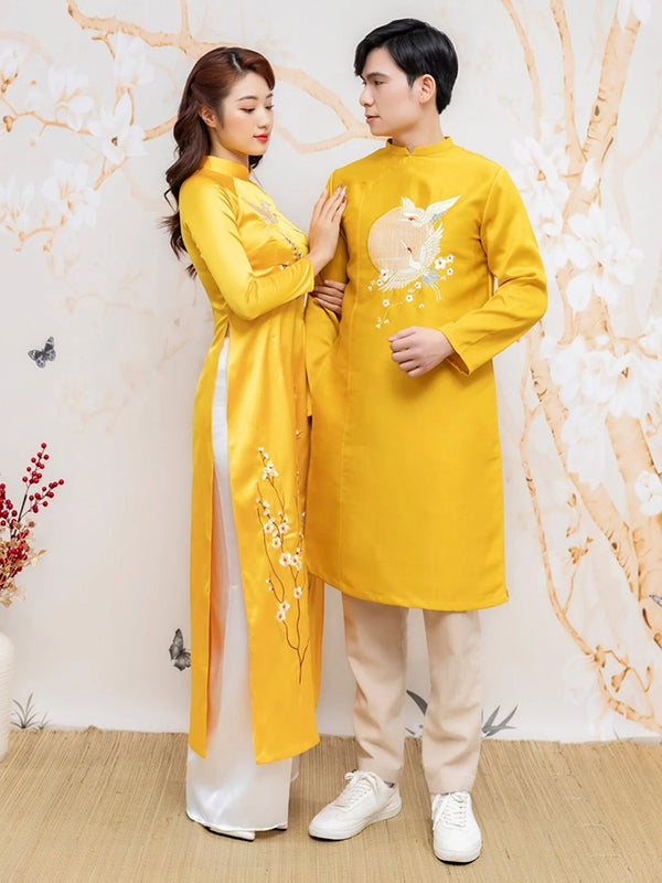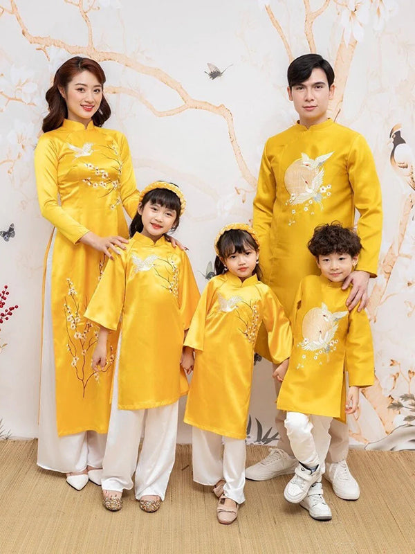 Family Ao Dai Yellow Embroidery Women And Girl Ao Dai Top Pants Men And Boy Ao Dai Top